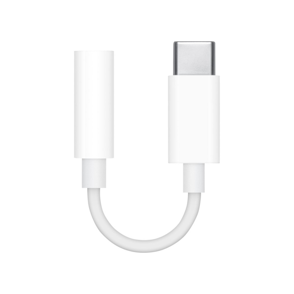 Apple USB‑C to 3.5 mm audio adapter MU7E2ZM/A, white. Compact adapter that allows USB‑C devices to connect to standard 3.5 mm headphones; provides stable, interference‑free audio and is manufactured to Apple original quality for reliable daily use.