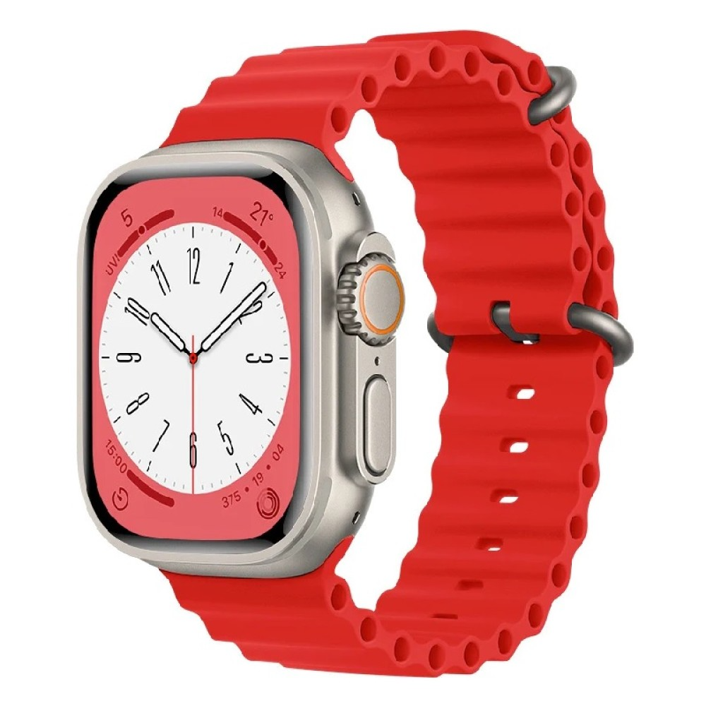 Red breathable silicone strap for Apple Watch 38/40/41mm (M/L). Perforated design for airflow, soft durable silicone, secure pin‑and‑tuck closure and easy installation for quick style changes.