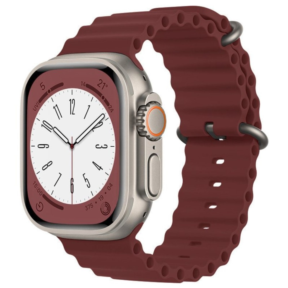 Wine red breathable silicone strap for Apple Watch 42/44/45/49mm (M/L). Soft, sweat‑resistant silicone with perforated airflow channels, adjustable pin‑and‑tuck closure and secure, comfortable fit for active use.