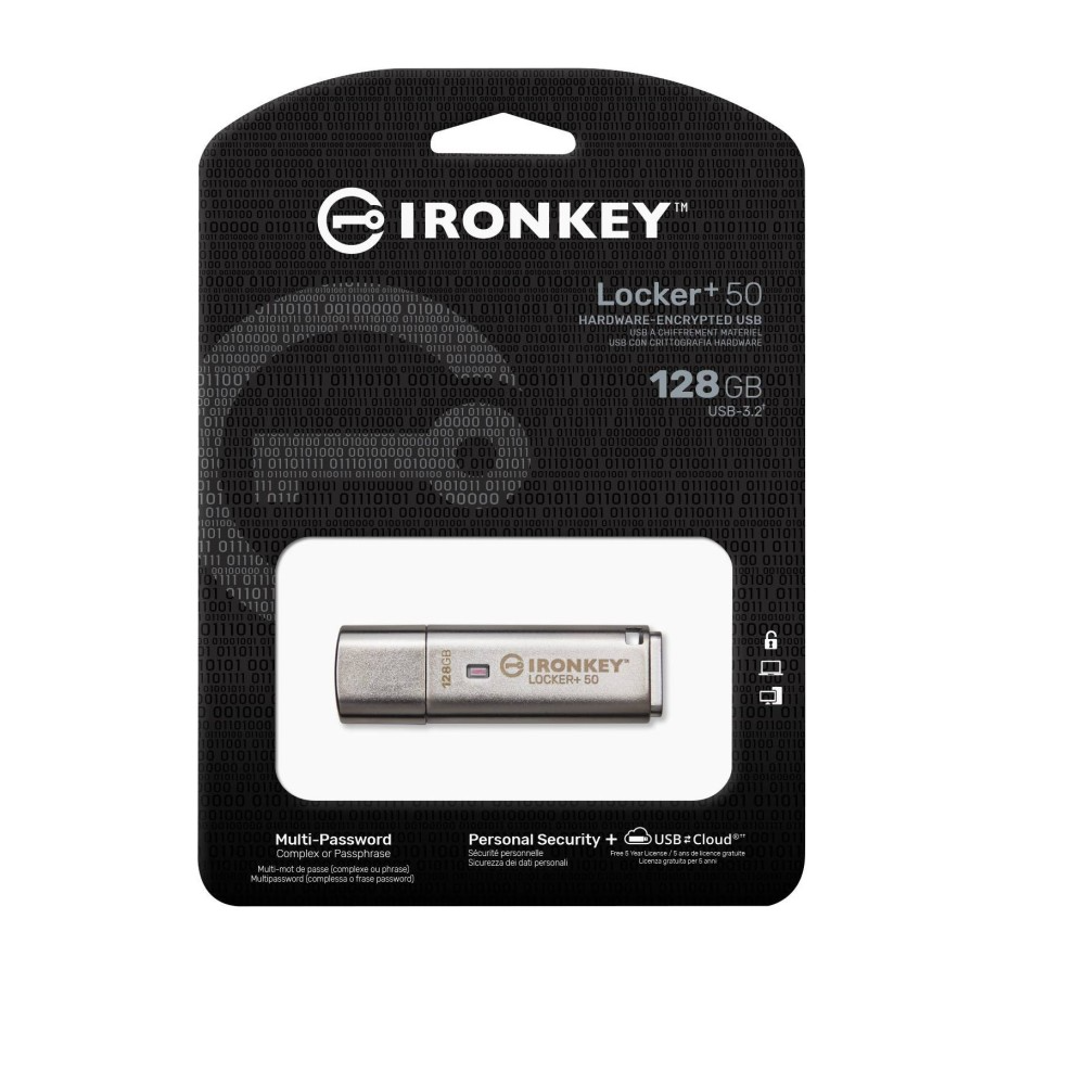 Kingston IronKey Locker Plus 50 128GB AES‑encrypted USB with cloud integration for secure cross‑platform storage.