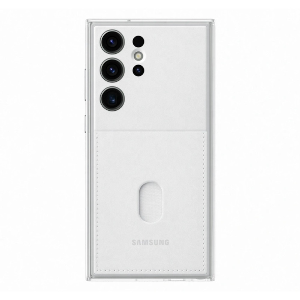 Frame style protective case with integrated card holder for Samsung Galaxy S23 Ultra (SM‑S918B). Rugged yet slim protection with exact port access, secure card slot and clean white finish; original Samsung model EF‑MS918CWEGWW.