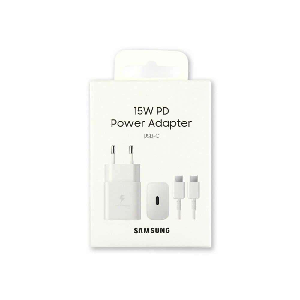 15 W USB‑C fast charger with 1 m USB‑C cable, white. Original Samsung retail kit offering dependable 15 W fast charging with included cable; sleek finish and robust construction for home and travel.