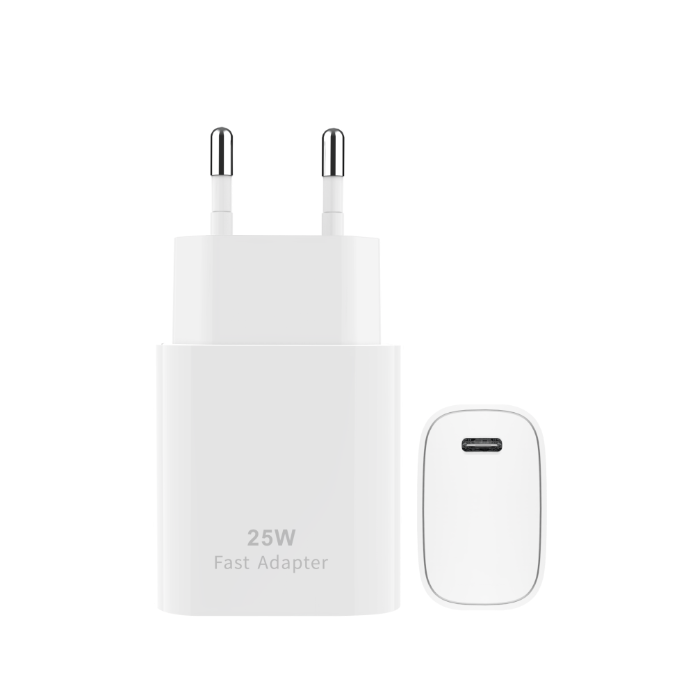 25 W USB‑C fast charging adapter, white. CH2023 compact charger delivering 25 W output for quicker charge cycles; portable design and safety protections for reliable daily use.