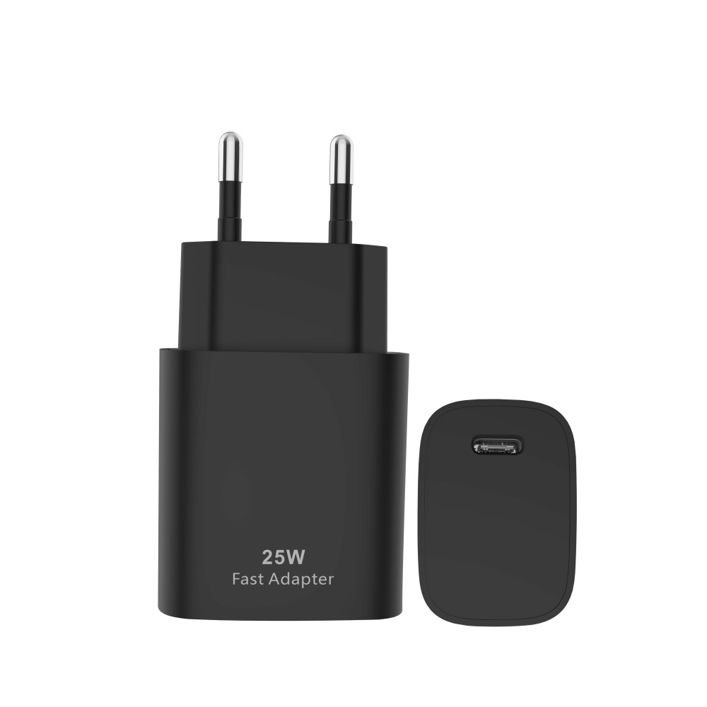 25 W USB‑C travel adapter, black. Portable CH775 charger delivering 25 W fast charging for a wide range of USB‑C devices; robust build, tested safety features and sleek finish.