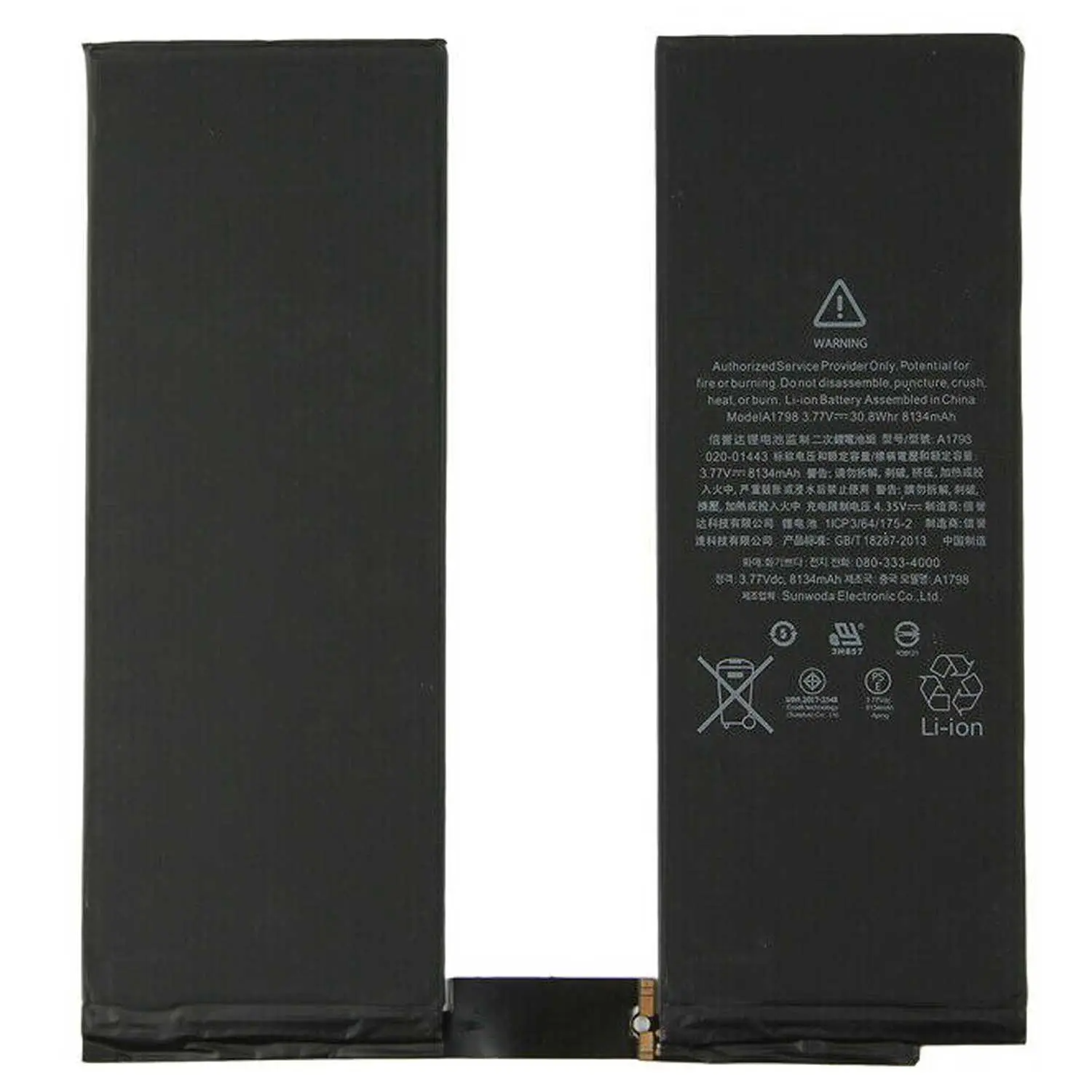 Compatible lithium-ion battery for Apple iPad Pro 10.5 (2017). 8134 mAh (30.8 Wh), non-removable. Please discharge to 0 % twice and fully charge to 100 % for cell longevity. Compatibility: Model A1798.