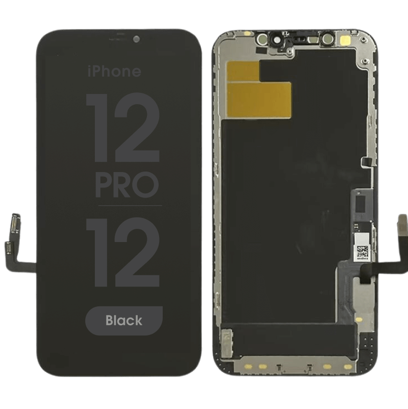 Hard‑OLED display and Touchscreen assembly, premium with removable IC, 90Hz, includes frame; Compatible-style replacement for both models. Compatibility: iPhone 12 / 12 Pro (multiple model codes).