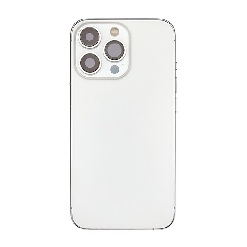 Complete rear housing with all small parts, excludes battery and back camera; Silver finish; compatible with iPhone 13 Pro Max (A2643/A2484/A2641/A2644/A2645).