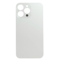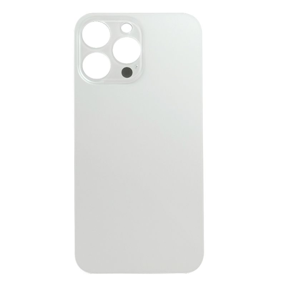 Replacement silver glass back cover with enlarged camera frame for iPhone 14 Pro Max. Designed for precise fit and durability, it restores the phone’s look and protection after damage.