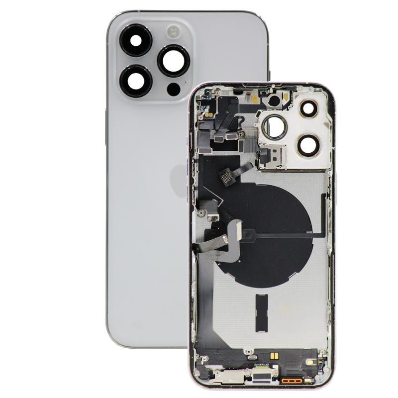Complete rear housing with all small parts, excludes battery and back camera; Silver finish; compatible with iPhone 14 Pro Max (A2894/A2651/A2893/A2895).