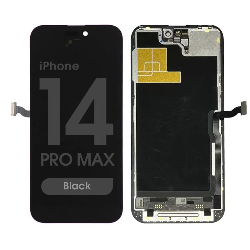 In-Cell LTPO Super Retina XDR OLED display assembly, 120Hz, HDR10/Dolby Vision; includes frame; integrated touch sensor for slimmer assembly. Compatibility: iPhone 14 Pro Max (A2651/A2893/A2894/A2895/A2896).