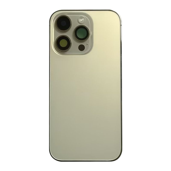 Complete rear housing with all small parts, excludes battery and back camera; Gold finish; compatible with iPhone 14 Pro (A2890/A2650/A2889/A2892).
