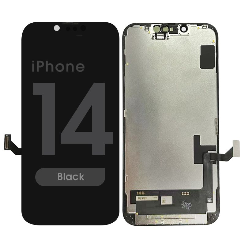 Soft OLED display and Touchscreen assembly (Soft OLED, IC removable), 90Hz, 6.1 inches, includes frame; supports True Tone workflows (iOS 18.1+ recommended). Compatibility: iPhone 14 (A2882/A2649/A2881/A2884/A2883).