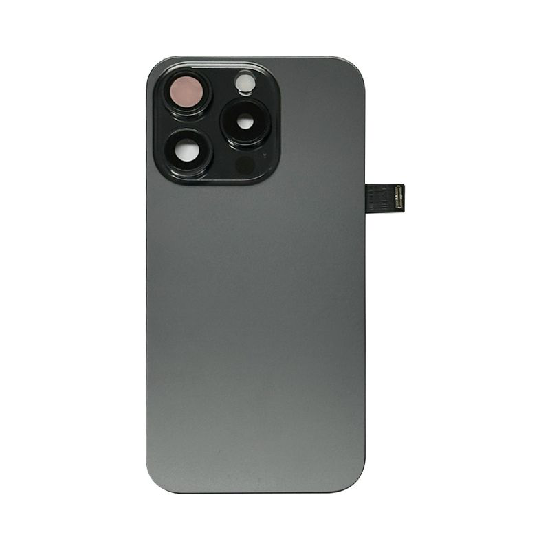 Complete rear housing with all small parts, excludes battery and back camera; Black Titanium finish; compatible with iPhone 15 Pro (A2848/A3101/A3102/A3104).