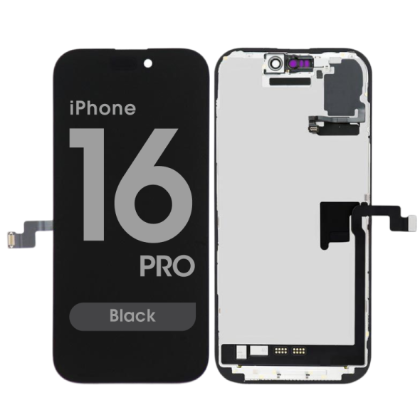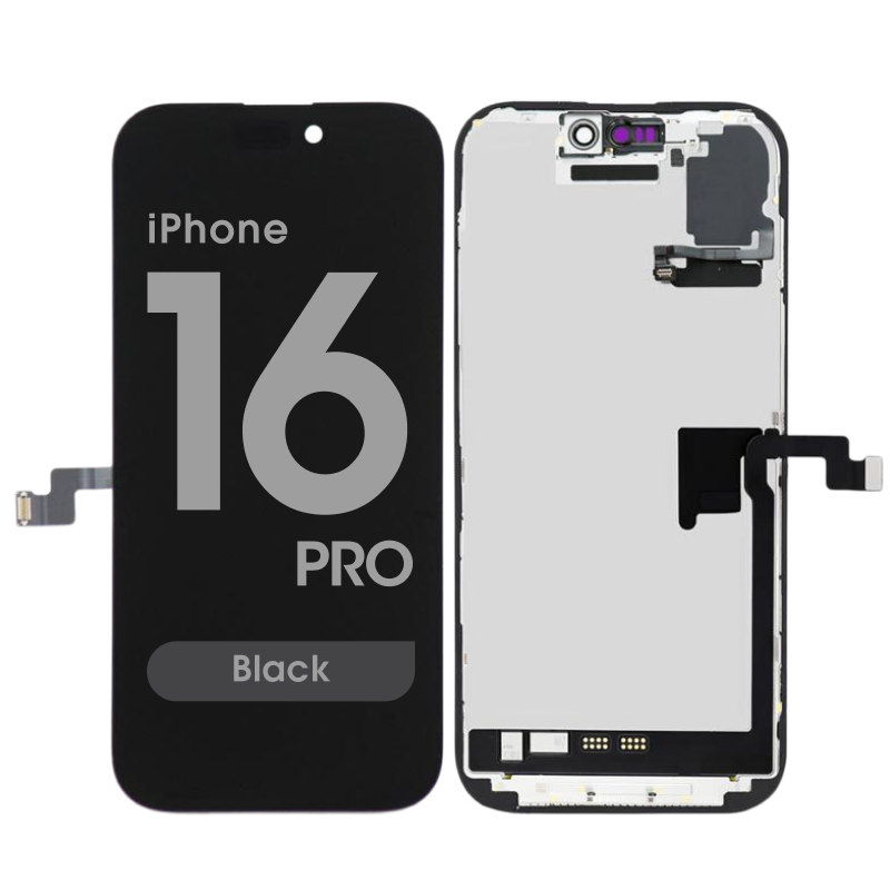 Service Pack LTPO Super Retina XDR OLED display assembly with proximity sensor flex, diagnostics supported; includes frame and used components for professional repair. Compatibility: iPhone 16 Pro.