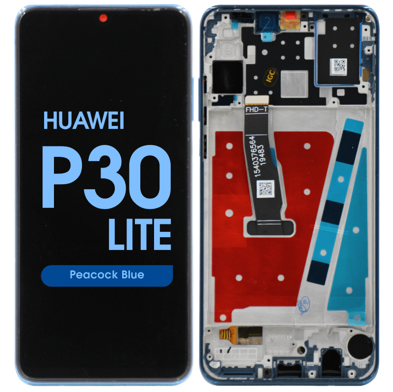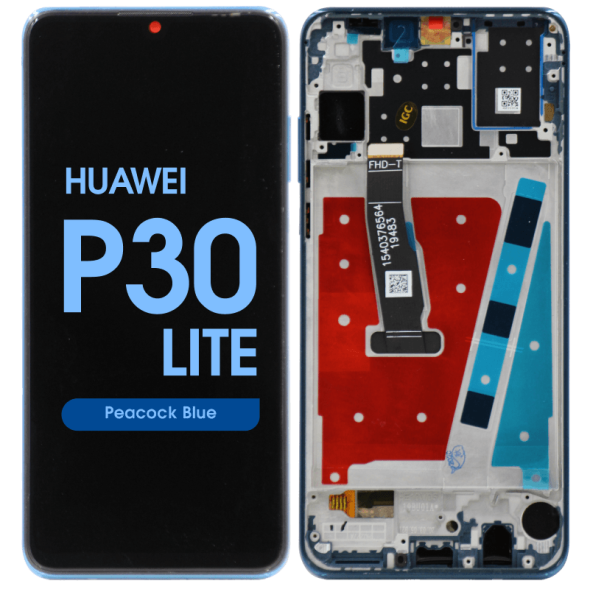 IPS LCD screen with frame; fits P30 Lite (MAR-LX1M); Peacock Blue variant.