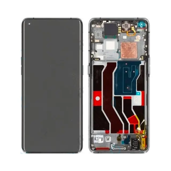 Service-pack complete display with frame for Find X3 Pro in gloss black; pre-assembled replacement to restore fit and finish.