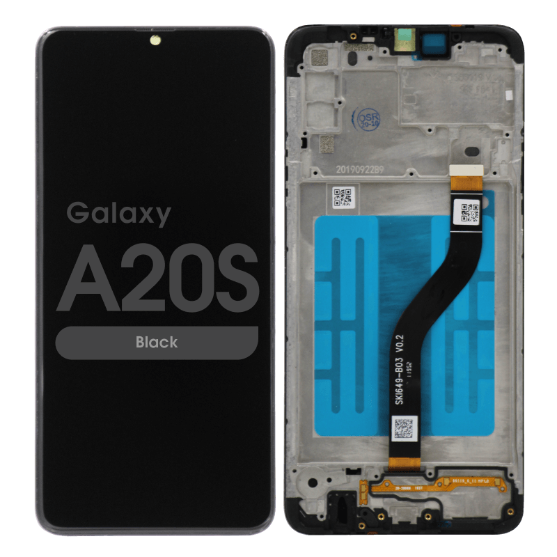 Replacement display (no frame) for Galaxy A20s SM‑A207F; service pack.