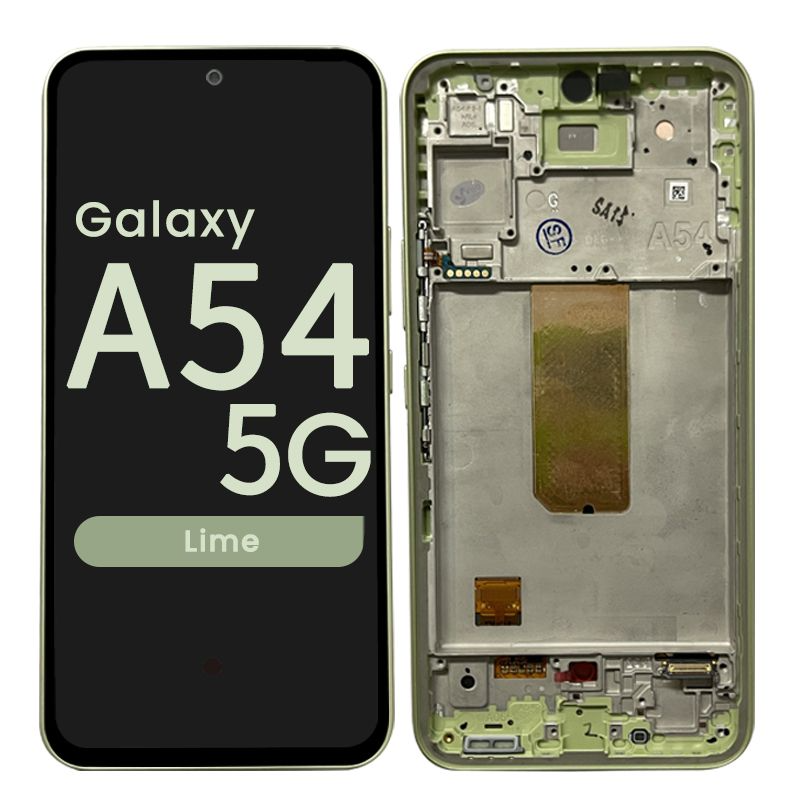 Super AMOLED 6.4" 120Hz 1080x2340 complete display with frame for Galaxy A54 A546B in green; service pack quality.
