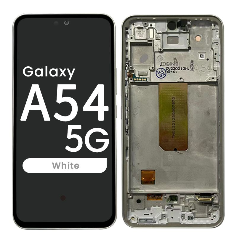 Super AMOLED 6.4" 120Hz HDR10+ 1080x2340 complete display with frame for Galaxy A54 A546B; soft OLED quality.