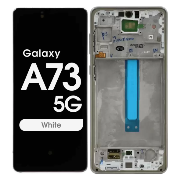 Super AMOLED Plus 6.7" 120Hz 1080x2400 complete display with frame for Galaxy A73 5G SM‑A736B in white; Gorilla Glass 5; service pack quality.