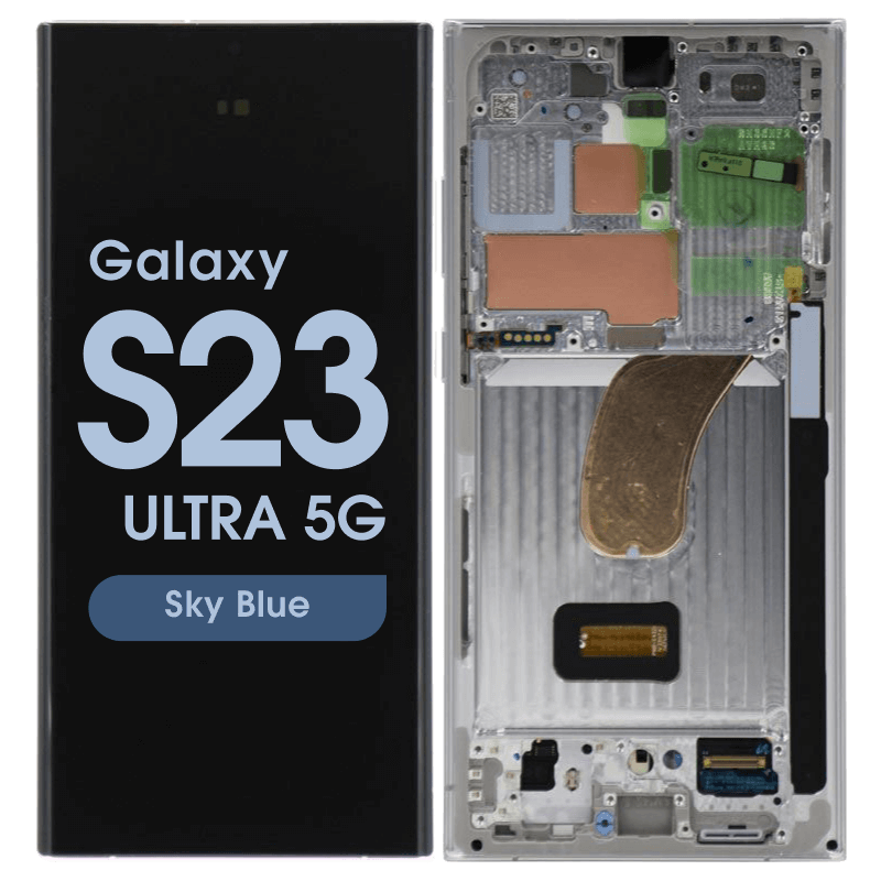 Dynamic AMOLED 2X 6.8" 1440x3088 complete display with frame for Galaxy S23 Ultra SM‑S918B in lime/sky blue; Gorilla Glass Victus 2; service pack quality.